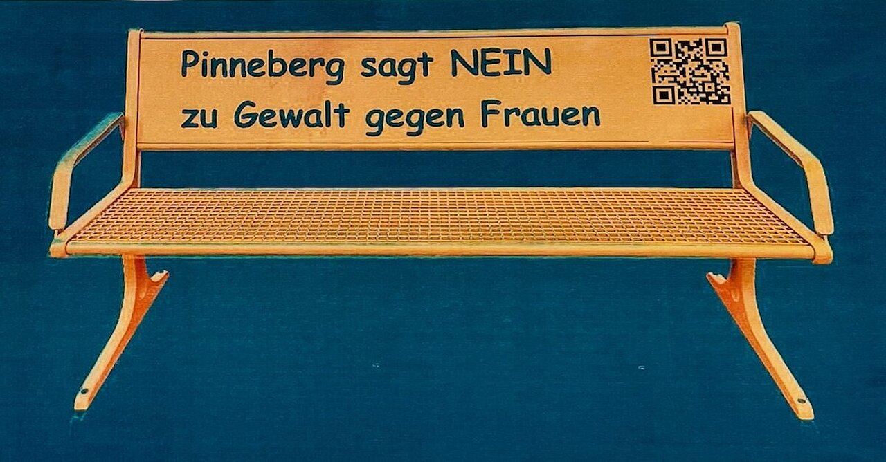 Mit Unterstützung von Bürgermeister Thomas Voerste hat das Bündnis einen Spendenaufruf zur Aufstellung der orangenen Stahlbank mit dem eingravierten Statement Pinneberg sagt NEIN zu Gewalt gegen Frauen gestartet. Auf einem angebrachten Schild mit QR Code sind alle Unterstützungs- und Hilfsangebote aufgeführt.