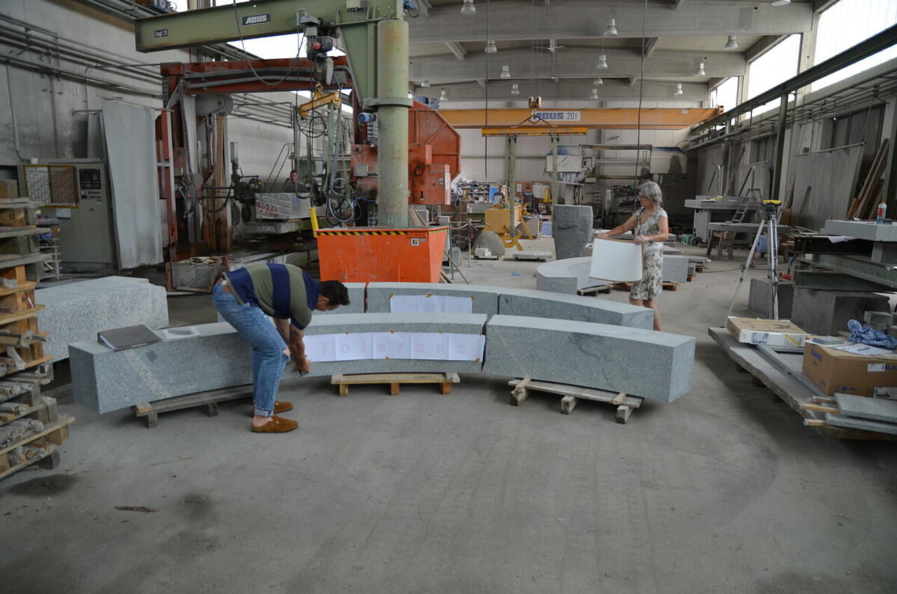 „Was die Steine betrifft, sind wir fast fertig“, erläuterte Haberland. Sie stammen aus einem Granitgebirge in der Nähe von Passau, Haberland war für die Auswahl der Steine selbst im Steinbruch. Der Sitzkreis wird aus drei Elementen bestehen, jedes hat ein Gewicht von zirka 650 Kilogramm, die Bogenlänge pro Element beträgt fünf bis sechs Meter. Der gesamte Durchmesser des neuen Mahnmals wird sechs Meter betragen.