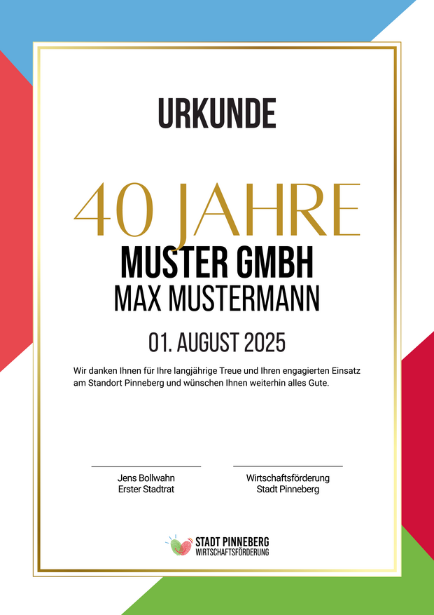 Daher gratuliert die Wirtschaftsförderung der Stadt Pinneberg gern zu besonderen Arbeitsjubiläen und stellt auf Wunsch eine offizielle Urkunde aus – für Jubiläen ab 10, 25, 40 oder 50 Jahren Betriebszugehörigkeit.